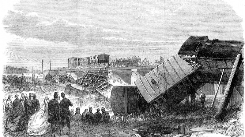 Railway travel is not always a magical experience, though. Although it’s much safer than riding in a car, things can go wrong. On 9 June 1865, the Folkestone-to-London boat train derailed at about 50 miles per hour (80km/h) while crossing the Beult River viaduct, a modest structure about 3 metres high. Seconds earlier, after passing through Headcorn railway station the driver had seen a man waving a red flag. But he could not stop the train before it rolled onto the viaduct, where a length of track had been removed during engineering works. Seven of the coaches fell into the river bed, killing ten passengers and injuring forty. Among the passengers was Charles Dickens, who was travelling with a friend. Dickens survived and helped to look after the victims, some of whom died before they could be taken to hospital. Deeply distressed by the accident, he could not speak for days. According to his son, he never fully recovered before his death five years later.