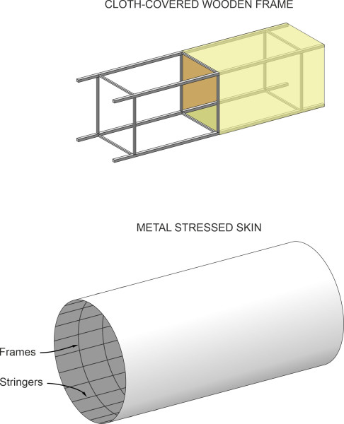Early aircraft were very different from the airliners we travel in today. The core structure was an open framework of wooden spars and struts. It was braced with wire to keep it rigid, and covered with canvas or silk to form a more-or-less smooth aerodynamic surface. Although flimsy, an open framework kept the weight down so the aircraft could fly given the limited power available from the engines and propellers available at the time. However, the situation changed as the engines became more powerful and the framework was exposed to greater aerodynamic forces. The fabric covering was replaced by metal sheet, and because a metal sheet could handle significant loads, the inner frame became less important. Around 1920, the Northern Irish company Shorts produced one of the world’s first aircraft with an all-metal monocoque fuselage, made from the aluminium alloy ‘duralumin’ [1]. As shown diagrammatically in figure 1, for a monocoque fuselage the skin became the main structural member, while the frames and stringers defined the body shape and stiffened the skin so it didn’t buckle under compression.