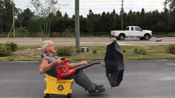 In figure 6, you can see Brian Kahrs of Clearwater, Florida, riding a vehicle he designed and built himself. Under his right arm he holds a leaf-blower, which provides thrust like a rocket engine. In his left hand he holds an umbrella. One might expect the umbrella to increase the frontal area and therefore the drag, but more important is the exhaust jet of the leaf-blower, which is pointing in the wrong direction. Yet Brian is travelling forward - pretty fast. Can you explain what is going on?