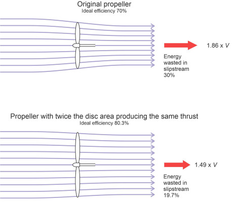 The way to do this is to have a large, slowly turning propeller. But a large propeller takes up a lot of room, and it has several other disadvantages including cost, weight, and a greater likelihood of accidental damage, so it’s useful to know what are the potential gains in relation to the costs – in particular, how much larger should the propeller be to achieve a specific pay-off? A good measure of the ‘pay-off’ is the improvement in ideal efficiency, or equivalently, the reduction in energy wasted in the propeller slipstream. Let’s take a simple example. Figure 2 depicts a propeller with an ideal efficiency of \(70\%\). The fluid velocity \(V_{\text{out}}\) in the slipstream is 1.86 times the input velocity \(V_{\text{in}}\). Can we improve the propeller’s efficiency by making it larger? Calculations show that if we double the disc area while maintaining the same thrust, the ideal efficiency increases to \(80.3\%\). Is this a worthwhile improvement? If you’re interested, you’ll find more details set out in the Appendix.