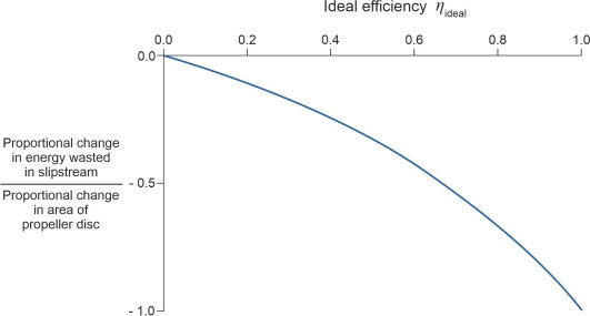 What does this mean in practice? In everyday language, if you increase the area of a propeller disc by a small increment, say \(1 \%\), the energy wasted in the slipstream will fall by \(\eta_{\text{ideal}} / \left( 2 - \eta_{\text{ideal}} \right) \%\). Imagine you have a propeller whose ideal efficiency is 80%, and you’re thinking of replacing it with a slightly larger one. If the disc area of the new propeller is 1% larger than the old one, the pay-off, the fall in wasted energy, will amount to [0.8/(2 - 0.8)] = 0.67% approximately. We’re assuming here that the operating conditions remain unchanged, including the speed of the vehicle, the thrust, and the power delivered to the propeller, so we are comparing like with like. However, as shown in figure 7, the pay-off varies with the ideal efficiency of the original propeller. Two points are worth noting. First, the ratio of the percentage change in wasted energy to the percentage change in \(A\) always lies in the range between -1 and zero, so the pay-off in numerical terms is always less than the change in disc area. Second, the pay-off for an inefficient propeller is smaller than the pay-off for an efficient one. Perhaps this explains why the propellers of small boats such as leisure craft tend to be less efficient than the propellers for larger commercial vessels.