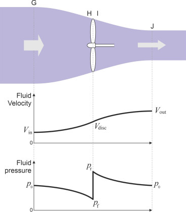 \[\begin{equation} p_{0} + \frac{1}{2} \rho V_{\text{in}}^{2} \quad = \quad p_{\text{f}} + \frac{1}{2} \rho V_{\text{disc}}^{2} \end{equation}\]Similarly for the flow downstream between station I and station J: