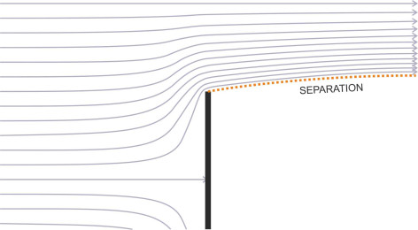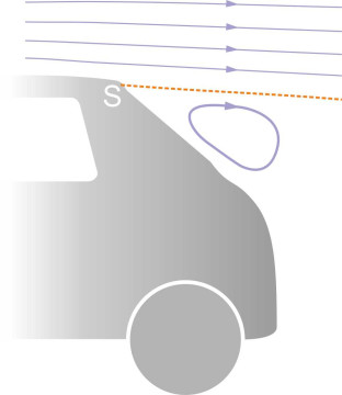 To make a fluid mass revolve, common sense suggests that some external agency is needed, something that grips the fluid and spins it around in the same way that you might grip a pencil and roll it between the palms of your hands. The obvious candidate is viscous friction, which enables chunks of fluid to transmit shear forces among themselves, so that a fast-moving layer sliding across the top of a slow-moving region of fluid can make the latter revolve. Over the years, experiments have shown that shear discontinuities of this kind occur in the wake of a moving body where the flow breaks away or separates from the body surface as shown in figure 6. The point of separation often occurs at a sharp corner, or at a point close to the rear of a bluff body such as the trailing edge of a passenger car roof, marked by the letter ‘S’ in figure 7. Like a sheet of sandpaper, the separated layer shears across the fluid beneath along the dashed line, and given a sufficiently low Reynolds number, the fluid beneath will revolve as a coherent body of fluid. The revolving mass is called a bubble vortex or separation bubble. The particles inside don’t necessarily move in the same way as the particles in a free vortex. Their velocity profile may be intermediate between that of a free vortex and that of a forced vortex.