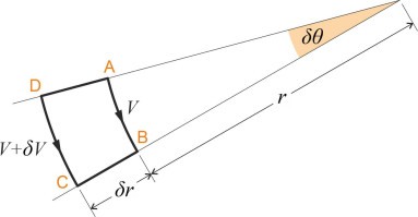 \[\begin{equation} U \quad = \quad \frac{k}{r} \end{equation}\]where \(k\) is a constant. It’s quite easy to check that this flow pattern is irrotational, by drawing a small element as shown in figure 3, and working out the circulation \(\delta \Gamma\) for that element. For the side AB, whose length is \(r \delta \theta\), we have a tangential velocity component \(- k / r\) (negative because it tends to rotate the element clockwise). For side BC the tangential velocity component is zero, and the same applies to side DA, so neither contributes to the circulation. Finally, for side CD, whose length is \(( r + \delta r ) \delta \theta\), the tangential velocity component is \(k / (r + \delta r)\) anticlockwise. Summing the increments of velocity times length around all four sides, we get