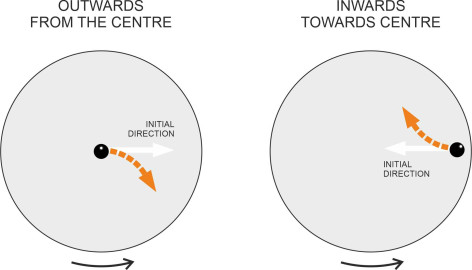 A similar effect occurs if you roll the ball in the opposite direction. Imagine you are standing close to the edge of the roundabout at a radial distance \(R_0\) from the centre. Now roll the ball inward towards the centre as shown on the right-hand side of figure 13. Before you let it go, the ball is travelling with you around the platform circumference. When it leaves your hand, its velocity has two components: a radial component \(v\) and a circumferential component \(\omega R_0\) to your right (assuming you are facing inwards). As the ball travels towards the centre of the roundabout, the radius of its trajectory decreases, the platform turns and the circumferential velocity of the platform beneath falls, so the ball’s inertia causes its path to veer away from the radial direction, again to the right. It’s not difficult to analyse and predict the geometrical path that the ball follows relative to the platform, but the dynamics are more subtle and more complicated than pictured in this brief introduction: in fact the ball undergoes two distinct types of acceleration, and to tease them apart is an interesting mathematical challenge. For now, we’ll just summarise what is going on as follows: the Coriolis effect changes the path of a freely moving body as viewed within a rotating frame of reference, accelerating the body at right-angles to its existing trajectory. If the rotation is anti-clockwise, the body veers to the right, but if it is clockwise, the body veers to the left. It can be shown that the acceleration has magnitude \(2 v \omega\), and this value applies not just to a body moving radially inwards or outwards, but also to a body moving circumferentially or indeed in any direction relative to the rotating frame of reference [4] [9].