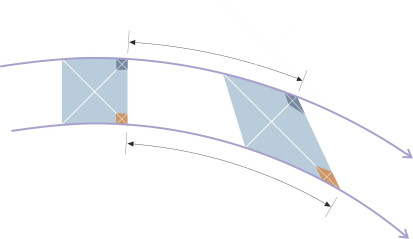 Equations equation 1 and equation 4 are crucial. They set out the defining features of a free vortex, which are that close to the centre, (a) the pressure falls, and (b) the velocity increases without limit. Such behaviour is counter-intuitive, and it’s worth pausing for a moment to imagine how it might come about. Since a free vortex is irrotational, the individual particles have zero angular velocity, each continuing to face the same compass direction as it orbits the centre. This applies not only to vortices, but in fact is a defining characteristic of any ‘potential flow’, i.e., a flow pattern involving an ideal fluid in steady motion. It arises because the particles in an inviscid fluid can only interact in one way. They can squeeze each other so their shapes become elongated, but since none can exert or respond to a ‘grip’ – a tangential force - they can’t be persuaded to rotate. Imagine a chunk of fluid on a circular orbit; in figure 4 it appears coloured in blue. At the beginning the outline is more-or-less rectangular, but as the fluid chunk moves round the curve, it deforms into a diamond shape so that the legs of the diagonal cross remain at an angle of \(45^{\circ}\) to the horizontal axis. If they didn’t, we would know the fluid was rotating. Now consider the two smaller particles indicated by the dark blue rectangle in the top right-hand corner and the red one in the bottom right-hand corner. The red one travels further, indicating that the particles on the inside of the curve travel faster than those on the outside. You can think of the fluid as propelled forward like the paste coming out of a toothpaste tube, squeezed between the streamlines on either side.