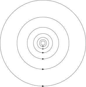 The air currents inside a hurricane or typhoon are quite complicated, but the process is driven essentially by a ‘pump’ that sucks out fluid and removes it from the flow field. At the centre of the storm is a damp column of air which expands and rises when heated by the sun. It’s a self-sustaining process because the vapour in the column condenses and releases latent heat which itself warms the column, and as the air ascends more rapidly into the stratosphere, it draws in cooler air from the surrounding region below. We shall picture the flow field as a two-dimensional disc at surface level, noting that there is effectively an exit at the centre; it is marked with the letter ‘E’ in figure 1a. If there were no circulation, the particles would be drawn radially in straight lines towards E, and it’s not difficult to see that they must speed up as they do so. If we divide the flow field into concentric rings centred on E, the rate at which particles cross any ring must be the same as the rate at which they cross any other ring. Since the circumference of each ring is proportional to its radius r, then provided the fluid is incompressible and the disc is of roughly uniform thickness, the radial velocity of the particles must be inversely proportional to r, increasing rapidly as they approach the centre. This doesn’t explain the circulation, but if tangential motion does occur the pumping action will reinforce it, stabilising the system around the rising core so that it can persist for many weeks.