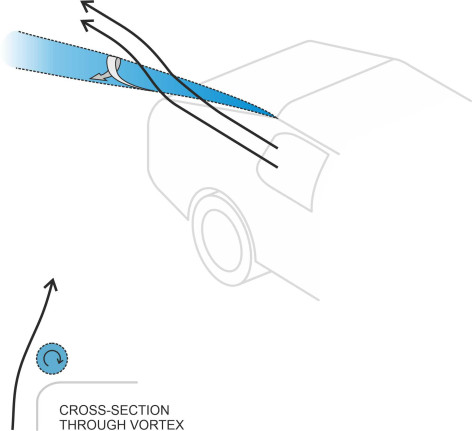 So far we have concentrated on what happens inside a vortex at a typical cross-section. Now it’s time to look at the three-dimensional whole. A vortex is not just a flat disk, but more like a cylinder that extends above and below the plane of the cross-section as shown in figure 9, so that the particles revolve around a line along the central axis as opposed to a single point. Analysts call the axis a vortex filament. In a tornado or in your kitchen sink, the filament is roughly vertical, but in the case of a moving vehicle this is not usually the case. Here, each vortex springs from a line of separation that we can imagine painted on the body surface. As described in Section C1416, aft of the rear window of a hatchback there is often a line of separation situated horizontally at right-angles to the direction of motion. Provided the vehicle isn’t moving very fast, it generates a bubble vortex that is carried along in the vehicle’s wake as shown in figure 10; in fact two such vortices are shown, rotating in opposite directions. If, on the other hand, the line of separation is not normal to the direction of vehicle motion but inclined at some other angle as shown in figure 11, a bubble forms underneath as before, but the vehicle leaves the rotating mass stretched out behind in the form of a trailing vortex in which the particles now follow a corkscrew path [5] [7]. Sometimes the line of separation is almost parallel to the direction of fluid flow, as happens underneath a ship’s hull either when moving straight ahead as described in Section M1619, or during a turn as described in Section M0505.