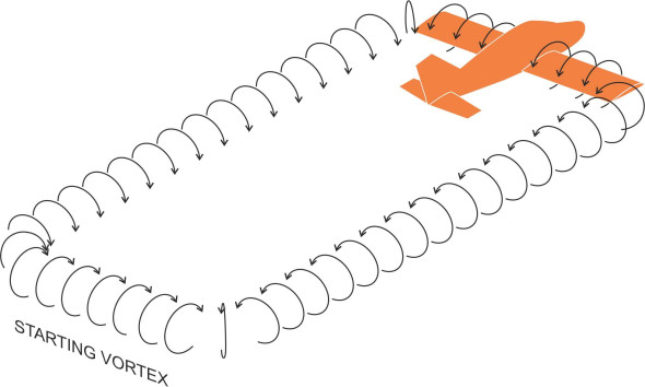 By comparison, vortex rings are less common. In past centuries, smokers would amuse children (and each other) by blowing smoke rings across the room. In still air, they were sufficiently stable to last for several seconds. On a larger scale, the vortex ring is an integral part of the process that generates ‘lift’ to support an aircraft in flight. You’re probably aware that an aircraft creates a trailing vortex at each wingtip. The two vortices actually form part of a continuous loop. At the front they merge with the air circulating around the wing cross-section, while at the rear they are connected to something called the starting vortex that comes into being and rolls along behind of the wing when the aircraft starts to move along the ground before taking off. Once the aircraft is aloft, the loop stretches out and the starting vortex is left behind (figure 12). It soon dissipates owing to viscous friction.