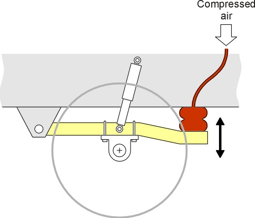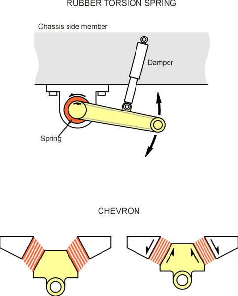 Today there is a wide variety of materials to choose from, including rubber (figure 7) and compressed air (figure 8). Rubber springs are used on road vehicles of all kinds, and less often, on railway bogies. They are light and compact, which is helpful particularly in the restricted space underneath the wheel arch of a small car (Section C1405). Air springs are used on heavy lorries and railway passenger trains.