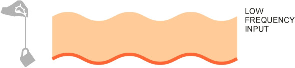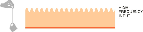 The next experiment takes place at high speed. Make your hand flutter up and down very quickly, just a couple of centimetres. The cup should remain stationary. Here, we observe the effects of high-frequency input (figure 3). The spring (the rubber band) expands and contracts to take up the roughness of the road surface while the body is largely isolated from the energy flow. These are the conditions under which suspension works best.