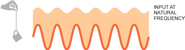 Now the final part. Try moving your hand at different frequencies. At some intermediate value the teacup will start to oscillate violently (figure 4). If you time the pulses correctly, you can make it bob up and down several centimetres with only a small input. The large output arises because the system accumulates individual pulses of energy and doesn’t give them back. By injecting an input at the natural frequency you have excited resonance, and the frequency should be at the natural frequency of the system, i.e., the value noted during the preliminary test. If a car were subjected to bumps at regular intervals corresponding to this frequency, the passengers would be very uncomfortable indeed, and in fact they would be better off with no springs at all.
