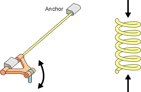 When iron-masters began making steel during the seventeenth century, coachbuilders found it a useful material for laminated springs. These springs later evolved into the semi-elliptical springs used on early automobiles (figure 5), and heavier versions formed the basis of suspension for steam locomotives and rolling stock. Cheap and rugged, they are still produced for trucks. But during the last century manufacturers developed more efficient shapes, namely the torsion spring and the coil spring. A torsion spring is just a steel rod that resists being twisted, whereas a coil spring is really a torsion spring wound into a helix (figure 6). Both are capable of storing large amounts of energy in a small space, and are lighter than equivalent leaf springs.
