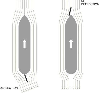 You steer a road vehicle by swivelling the front wheels, so the nose swings in the direction you want to go, and the rest of the body follows on behind. With ships, it’s the other way round: the stern swings first because that’s where the steering gear – usually a single rudder - is mounted (figure 1). Why the stern? There are two reasons for this. First, a rudder works by deflecting water, and the reactive force pushes the rudder blade to the right or left depending on its angle relative to the direction of motion. But this can only happen if the fluid particles are free to deflect at an angle to the ship’s longitudinal axis as shown in the first diagram in figure 2. If the rudder were placed in front, the water couldn’t do this; regardless of the rudder angle it would divide more-or-less equally around either side of the hull. Second, a rudder works best in the slipstream of the propeller: here the fluid is moving faster and producing more ‘lift’ even when the vessel itself is moving at a low forward speed.
