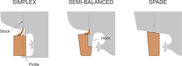 Since the rudder is vital to safe navigation, marine architects devote considerable attention to its size and shape, together with the way it is attached to the hull. There are several different arrangements: figure 5 shows the ones most commonly in use today. The rudder on the left, sometimes called the ‘simplex’ type, can still be found on older ships. The blade pivots on two bearings, one at the top and one at the bottom. The lower bearing is called a pintle: it carries the weight of the rudder and transfers it to an arm projecting underneath the propeller from the rear of the keel, which gives the rudder blade protection from underwater obstructions. The axis of rotation is at the leading edge of the blade (this is this axis that marine architects use to define the rear ‘perpendicular’ from which the ship’s length is measured). Bolted to the top of the blade is the rudder stock, a strong steel bar that pivots around the same axis to make the rudder swing from side to side.