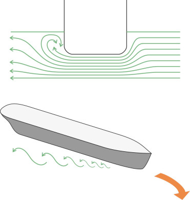 Of course, the fluid motion is more complicated than our intuitive model would suggest, for two reasons. First, in a tight turn the angle of attack varies along the length of the hull. As shown in figure 16, at any given moment each part of the hull is moving in a different compass direction, so the concept of a fixed drift angle breaks down. In these circumstances, some analysts prefer to think in terms of a pivot point around which the hull appears to rotate [16] [14] – as figure 16 makes clear, this is the point along the hull whose curved path lies tangential to the ship’s longitudinal axis. Second, the cross-flow of water underneath the bilges creates a vortex in the same way as the air that leaks around an aircraft wingtip (figure 17). The vortex implies a dissipation of energy, meaning that the ship’s resistance to forward motion has increased, echoing the manner in which an aircraft wing creates induced drag. The larger the drift angle, the greater the resistance, so that when a ship turns it will slow down, and in a tight turn with the rudder hard over its speed may fall by as much as a half [3].