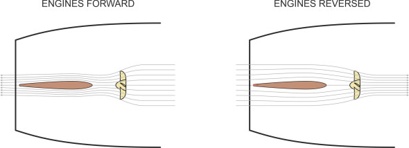 When a driver reverses a car or a truck, the steering works almost as well as it does when going forward. But a ship is different. When going astern, the steering response becomes unpredictable, for two reasons. First, the ship is moving in effect with its rudder at the front, and we’ve already seen that a bow-mounted rudder can’t produce much lateral thrust because the propeller slipstream clings to either side of the hull. Nor would it achieve very much if it could. When a ship yaws, the point around which it pivots – the neutral point – lies close to the bow, and in these circumstances, the rudder has limited leverage. Secondly, the rudder is no longer in the propeller slipstream (figure 20), and the hydrodynamic forces on the rudder blade are correspondingly reduced. In practice, a ship is difficult to control when going astern, and may even turn in the direction opposite to the one intended.