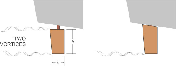 What about the shape in side elevation? We know that a wing or a hydrofoil will lose energy through vortices that curl around the wingtips. Such losses imply a reduction in lift, but the reduction is less pronounced if the wing is long and narrow: the higher the ‘aspect ratio’ of length-to-chord, the greater the lift. In practice a high aspect ratio is not possible in a ship’s rudder, which must be relatively short and sturdy in order to survive heavy seas and accidental impacts. But the designer can compensate by adjusting the gap between the top edge of rudder and the underside of the hull. A narrow gap removes one of the tip vortices and effectively doubles the aspect ratio (figure 7). Incidentally, the same is true of a ship’s sail: the gap between the bottom edge and the deck needs to be as small as possible so air can’t leak underneath.