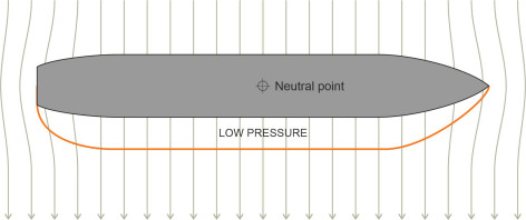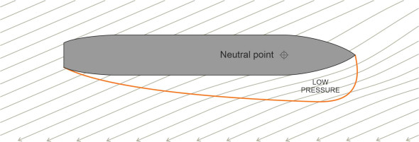 Although it arises from the distribution of water pressure along the ship’s hull, one can picture the force as acting at a single point, sometimes known as the neutral point. You might expect the neutral point to lie somewhere near the middle of the hull, because as shown in figure 14, when a ship is lying stationary in the water and you give it a sideways push, the resistance incurred by the two halves of the hull – front and rear – should be roughly equal. But the picture changes when the ship is moving forward. Typically, the neutral point moves to a position closer to the bow, less than 1/3 of the distance along the hull [13].