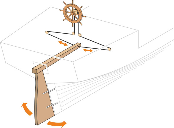 The origins of the rudder can be traced back to a simple device used by mariners at least five thousand years ago: an oar pivoted near the stern. Attached to the hull was collar that acted as a fulchrum through which the oar passed so the helmsman could hold it steady and adjust the angle of the blade. For a right-handed person, the most convenient location for a steering oar was on the starboard side, and indeed the history books tell us that the term ‘starboard’ derives from the words ‘steering’ and ‘board’. They also say that to avoid damaging the oar, ships would dock with the opposite side against the harbour wall, hence the term ‘port’.