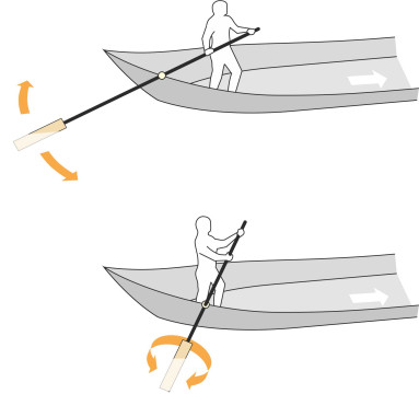 The history books don’t tell us much about the steering technique used by the ancients, but in principle there are two ways to get a purchase on the water. The first is to swing the oar to either side as shown in the upper part of figure 3. The second is to twist the oar around its longitudinal axis as shown in the lower part of the Figure. Either action changes the angle of the blade relative to the water flow, thereby generating a pressure difference between the two faces to steer the vessel to port or starboard as desired. It appears from early manuscripts that the steering oars attached to vessels such as the Viking longboat projected almost vertically into the water and hence the twisting action was the one actually used. But the helmsman on a Chinese ‘Dragon boat’ racing canoe, where the steering oar still survives today, uses a combination of both [1]