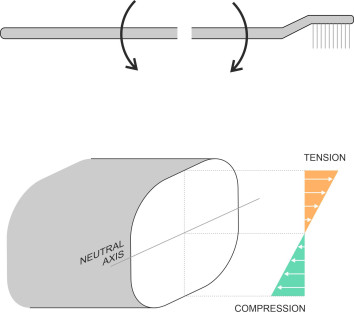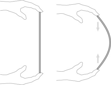 To round off this topic we’ll turn briefly to two other types of structural failure: failure in compression and failure in bending. Let’s admit first that there is no such thing as a ‘compression failure’, at least not in the same sense as the tensile failure described above – there is no direct analogue. The reason is that when subject to an increasing compression load, a strut of the kind that you’ll find in a ship’s hull or an aircraft fuselage won’t squeeze like molasses into a shapeless lump: instead, it will buckle. The mathematics of buckling is beyond our scope here, but we can get an intuitive sense of what happens by picturing the behaviour of an everyday object under load. Here, the problem is not the strength or weakness of the material as such, but rather the geometry of the member. If you press together the ends of a plastic ruler with increasing force as shown in figure 14, it will resist until the load reaches a critical value, when the ruler suddenly bends into a ‘U’ shape. Like a vaulter’s pole, if the material is sufficiently resilient it will return to its original shape when you let go. A less springy material will snap in the middle or bend permanently out of shape.
