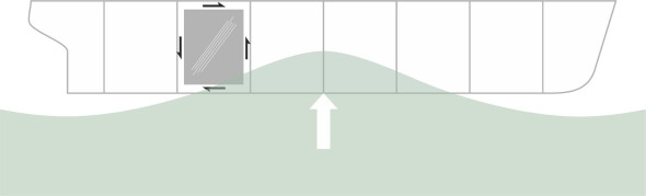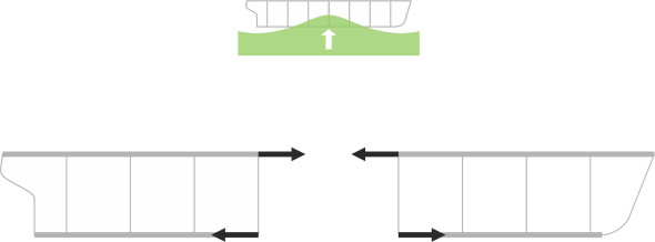 In structural terms, a ship is like a railway bridge. The difference is that most bridges span between two abutments without any support in between, whereas the weight of a ship is spread more-or-less evenly along the hull bottom. It sits on the water as if resting on an elastic foundation. The situation changes in rough water, but we’ll come to that in a moment – first let’s see what happens when the water surface is perfectly calm. This is only a preliminary exercise, but it’s an important one for a cargo ship because the cargo can weigh several times as much as the hull, and allowance has to be made for uneven loading between compartments. An empty compartment next to a fully loaded one can put the hull under severe stress in calm water even though the total load is well within the ship’s carrying capacity. It may even break the ship’s back, causing neighbouring compartments to shear apart as shown in figure 2. One can check whether this is likely to happen by dividing the ship into small sections and, assuming a particular pattern of cargo loading, calculating the forces acting on each section separately. These are the weight of the hull, the weight of the cargo, and the upthrust of the water. This leads to a ‘load diagram’ from which one can estimate the shear forces and bending moments at each section along together with the corresponding stresses in the plating and supporting frames [2] [6] [7].