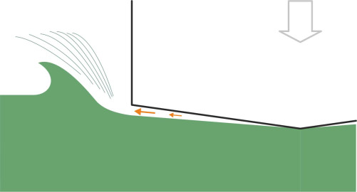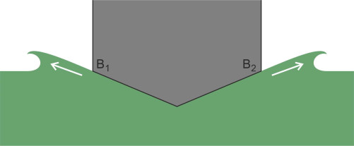 The situation is not very different from that of a planing vessel skimming across the water suface. It gets its support from ramming the fluid downwards at high speed: indeed, in Section M1718, we visualised planing as a two-dimensional phenomenon that could be simulated by dropping a wedge vertically onto the water surface. The same scenario applies to slamming. Back in 1929, the aerodynamicist Theodore von Kármán first conceived the wedge analogy while trying to estimate the impact of the water surface on a seaplane during landing. As shown in figure 8, he represented the hull as a 2-dimensional wedge that displaced fluid laterally to either side, ignoring any fore-and-aft component. By applying momentum considerations, von Kármán obtained a rough estimate of the slamming force as a function of the downward speed of impact \(V_R\) and the deadrise angle \(\beta\), and others subsequently improved on his results [1]. The angle \(\beta\) is critical. When it is small, the pressure near the perimeter of the contact area forces water out in a flurry of spray as shown in figure 9. The spray roots at the boundary are marked by the points B1 and B2.