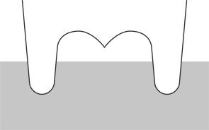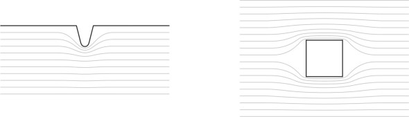 Steel is ductile too, and it’s the material from which most ship’s hulls are made. The ductility is essential, because, like many structures built on a large scale, a hull contains irregularities such as holes and surface notches. In the same way that the water in a stream speeds up as it flows around an obstacle, the paths that the loads follow inside the material squeeze together as they curve around any aperture or notch (figure 12), and the smaller the radius, the higher the stress. For example, a circular hole multiplies the value locally by a factor of three, and even higher values occur at the bottom of a scratch or notch where the radius is relatively small. However, ductile yielding comes to the rescue: the material yields and stretches in such a way that the radius of the notch increases. When the radius increases, the stress falls, and to some degree, the problem repairs itself.