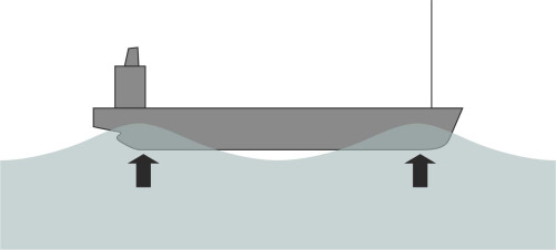 In a stormy sea the wave action brings in a new dimension, and the pressure on the hull is no longer uniform. When the waves grow beyond a certain height, the hull does indeed span between crests like a bridge, riding almost clear of the water surface in between the bow and stern (figure 3). It is commonly assumed that the waves move slowly, so they can be treated as if frozen in time - in other words, dynamic effects such as momentum, acceleration, and vibration can be ignored. A wave can take up any position along the ship, but there are two configurations likely to induce high stresses. They occur (a) when the hull ‘hogs’ over a single wave with the bow and stern unsupported, and (b) when it ‘sags’ between two waves with the centre unsupported. In either case it is possible to work out the hydrostatic pressure that each wave exerts on the hull assuming a trochoidal profile for the water surface, suitably adjusted using the Smith correction as set out in Section M1820. Treating the hull as a simple beam, one can then work out the stresses in the ship’s bottom, in the deck, in the hull plating, and in the reinforcing framework. One can also work out the deflections: when bridging between two waves, a medium-sized ship will sag by several centimetres in the middle relative to the bow and stern, while a larger ship will sag by half-a-metre [8].