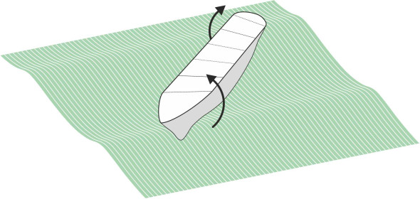 This method of analysis overlooks several complications. It has been described as a ‘comparative approach’ for assessing a design against existing vessels of similar size and construction [7]. But it can’t handle the more complicated loading patterns that occur under wave impact such as racking forces in the transverse plane when the ship rolls (figure 4), or torsional loads over the cross-section if the waves approach at an angle as shown in figure 5. And nowadays the International Association of Classification Societies (IACS) requires the designer to take into account the statistical probability of failure [9]. Hence computer programs are routinely used to estimate the load pattern and to derive a statistical description of bending moments so that one can determine the likely range of variation together with the probability of extreme values exceeding the design limits. They incorporate wave spectra and use Response Amplitude Operators (RAOs) to account for the dynamic response of the ship. In addition, finite element packages can reveal the stress patterns that arise in different parts of the hull structure.