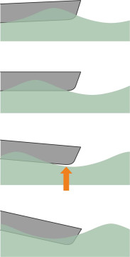 If you watch a film of a ship in a storm, you’ll see the vessel rise over each crest and after a pause, crash into the next trough, with spray cascading over the deck in spectacular fashion. The sequence is shown diagrammatically in figure 7. In severe cases, a gap appears momentarily underneath the hull before it lands on the water. Under such an impact, the water behaves more like a solid than a liquid, and the result is a phenomenon called ‘slamming’.