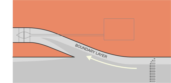 Now consider the same waterjet system installed in a conventional craft with the intake flush with the underside of the hull. The intake draws in fluid from the boundary layer. But this fluid is already moving in the same direction as the boat. Before entering the aperture, it is dragged along through friction with the hull surface (figure 11), and relative to the hull, it enters the duct more slowly than it would in the case of the hydrofoil scoop. Let’s assume the waterjet accelerates the fluid through the same velocity increment as the hydrofoil scoop so the system develops the same thrust. By comparison, there is less kinetic energy wasted in the exhaust stream because it exits at a lower speed. Hence the efficiency is greater - the engine uses less fuel to attain a given thrust - and it does so by exploiting the drag imposed by the vessel itself on the surrounding water! Together with reduced blade tip losses, wake ingestion makes the waterjet nearly as efficient as a conventional propeller, with a value typically within the range 65\(\%\) - 80\(\%\) [21]. Incidentally, aerospace engineers believe that the same effect could be exploited to boost engine thrust levels for a ‘blended wing’ aircraft [3].