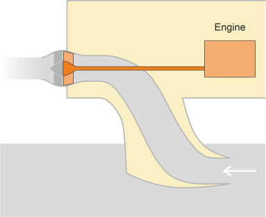 For many years, inventors have been experimenting with a device that carries this idea further, by extending the duct into a long, thin tube that curves upwards into the hull and extends aft to the transom, where the fluid exits above water level. The propeller is placed near the aft extremity. Such a device – known as a waterjet, draws in fluid from underneath the boat and pumps it out at the stern. The first practical example was created in 1931, and since that time, waterjets have been used in growing numbers to drive small and medium-sized craft intended to operate in situations where speed and manoeuvrability are vital [8] [13]. There is no drag-inducing machinery below the waterline, just an intake. Water passes diagonally upwards through the intake and travels via the duct to a pump that pressurises the fluid and forces it out at a high velocity like a jet engine or a rocket motor. The schematic layout is shown in figure 8. By pivoting from side to side, the exit nozzle acts as a rudder, and attached to the nozzle is a deflector plate that provides reverse thrust when needed [7] [12]. This gives the waterjet craft great manoeuvrability, and furthermore the pump can be designed so it is less liable to cavitation than a conventional propeller and is therefore capable of operation at higher speeds. You can find more details in [23].