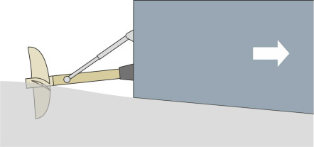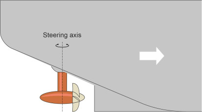In confined surroundings, a swivelling propeller makes a ship easier to handle because it can swing the stern to port or to starboard when it is travelling too slowly for the rudder to have much effect, which, of course, is what an outboard motor does. The equivalent for a larger craft is the so-called ‘pod’ drive. As shown in figure 6, it consists of a propeller attached to a steerable nacelle mounted below the stern that contains either an electric motor or a transmission shaft geared to the ship’s engines. Such units are often installed on passenger cruise ships that berth in small or crowded ports. Some ships have multiple pods, for example two at the bow and two at the stern. The hull must be specially shaped to accommodate the units and the crew need special training [10] to avoid aligning the slipstream of one pod with the upstream face of another, which can cause damage. A much simpler concept is the ‘thruster’: an auxiliary propeller that is fixed with its shaft at right angles to the direction of motion so it provides lateral thrust. The most common type is a bow thruster fitted inside a tunnel that passes laterally through the hull below the waterline at the bow. Some ships have additionally a thruster at the stern. We’ll return to both types of device in Section M0505.