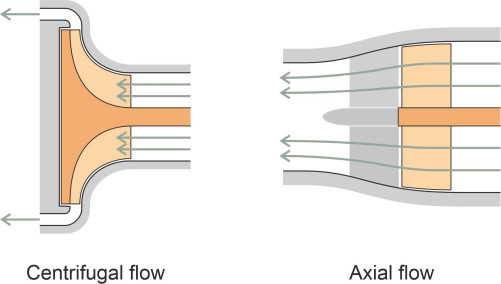 When a waterjet is fitted to a displacement craft or planing craft, the intake is located underneath, flush with the hull surface. This doesn’t work for a hydrofoil or a hovercraft, whose hull rises out of the water at speed, so the boat is provided with a ‘scoop’ or ram intake as shown in figure 9. The scoop delivers water to the pump, of which there are two main types: centrifugal and axial. The difference is shown diagrammatically in figure 10. The first type contains an impeller disc that whirls the incoming fluid around and throws it radially outwards; the centrifugal force drives up the fluid pressure at the outlet round the rim. By contrast the axial flow pump acts like a ducted propeller. The blades are shaped like those of a conventional ship’s screw and there is a stator located in the propeller slipstream. The propeller blades apply hydrostatic ‘lift’ that accelerates the fluid particles rearward, while the stator recovers what would otherwise be lost energy in the exhaust stream by counteracting the rotational movement induced by the impeller. Which type is best depends on how fast you want the boat to go [24]. Centrifugal pumps operate at lower speeds: they were the first to arrive on the scene because they were compact and relatively easy to make. Today, most pumps for larger vessels are ‘mixed’ in the sense that the fluid is taken through a combination of axial and centrifugal motions. In some cases there is an additional first stage: an inducer pump, shaped somewhat like a helical screw. Its purpose is to boost the pressure of the incoming water before it enters the ‘main’ pump, and thereby reduce the likelihood of cavitation. Inducer pumps were originally developed by the aerospace industry for use in rocket motors.