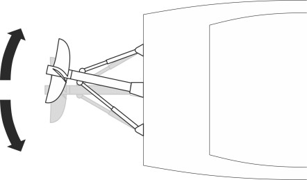 The efficiency of a cavitating propeller seems to be less than that for a sub-cavitating propeller, typically in the range 60 - 70\(\%\) [21], but engineers have improved matters by raising the propeller shaft to surface level so the blade disk is half out of the water, and located behind the stern rather than underneath (figure 4). A propeller of this kind is known as a surface-piercing propeller or ‘cleaver’ propeller. Being exposed to the atmosphere, the disk is ‘ventilated’, meaning that when it enters the water after passing through the twelve-o’clock position, each blade draws a bubble of air into the cavity on the suction face. The air bubble compresses as the cavity shrinks and prevents a violent collapse [12]. A cleaver propeller is usually made from stainless steel. Its diameter is not limited by the proximity of the hull and hence it can be designed to provide greater thrust than would be possible with a conventional screw. It can drive a boat at well over 100 knots [20], and is smooth in action with little vibration [12]. As shown in figure 5, if an articulated jointed is added to the drive shaft together with a pair of hydraulic rams to swivel the propeller disk, it can steer the boat as well.