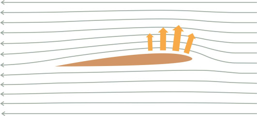 Anything that slices through the water can generate a lot of resistance so like an aircraft wing, a hydrofoil blade must be smooth and thin, with a ratio of thickness-to-chord in the range 0.075 to 0.09 [5] (see figure 1). Indeed, the foil works in the same way as an aircraft wing, and you’ll find the process described in more depth in Sections F1817 and F1816. It is inclined at a slight angle to the oncoming flow, which follows a curved path over the upper surface so that the streamlines are squeezed together above the leading edge and the particles are forced to speed up relative to the surrounding fluid (figure 2). In accordance with Bernoulli’s principle, the pressure falls and the blade is sucked upwards.