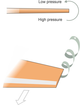 When moving at speed, a foil produces a characteristic wake. The curved upper surface sucks the water particles downwards, and being deflected, they acquire momentum in a new direction. This has two consequences. First, the downward force on the fluid produces an equal and opposite reaction, which is the lift applied to the hydrofoil blade. Second, since water is not a compressible fluid, any downward motion must be compensated by upward motion elsewhere, and in fact, water flows in from the sides to replace the deflected particles. The result is a circular pattern of motion when viewed from in front: a vortex that trails behind the outer extremity of each foil blade (figure 3). As explained in Section F1816, a similar phenomenon occurs with an aircraft wing.