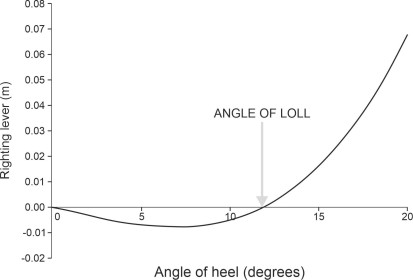 In contrast, a ship that corresponds to a point below the curve will not stay upright even in calm water. Instead it will rotate, and if not inundated by water pouring over the gunwales, may come to rest with its deck at an angle to the water surface – it lolls either to port ot starboard as shown in figure 14. The two positions are mirror images of each other [12]; they are only marginally stable.