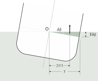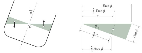 \[\begin{eqnarray} \delta R \quad & = & \quad \text{upthrust}\ \times \ \text{lever arm} \nonumber \\ & = & \quad \left( \frac{1}{2} \rho g Y^{2} \delta X.\tan \phi \right)\ \times \ \left[ \frac{2}{3} Y \cos \phi \left( 1 + \frac{1}{2} \tan^{2} \phi \right) \right] \nonumber \\ & = & \quad \frac{1}{3} \rho g Y^{3} \delta X.\sin \phi \left( 1 + \frac{1}{2} \tan^{2} \phi \right) \end{eqnarray}\]We obtain the righting couple associated with the extra wedge of water displaced on the starboard side by integrating along the length of the ship, and to get the overall value \(R\), double the result to allow for the additional righting couple produced by the emerging wedge on the port side to get