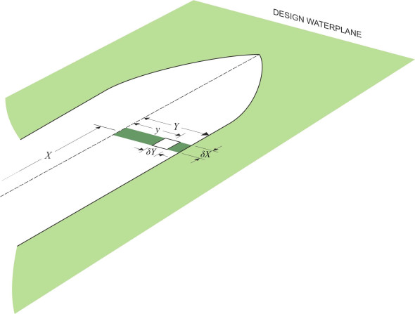 \[\begin{eqnarray} \delta I \quad & = & \sum y^{2} \delta A \nonumber \\ & = & 2 \int_0^{Y} y^{2} dy . \delta X \nonumber \\ & = & \frac{2}{3} Y^{3} . \delta X \end{eqnarray}\]If we do the same for all the strips that make up the length \(L_{WL}\) of the waterplane section and sum the results, we arrive at the second moment of area \(I_{\text{area}}\):