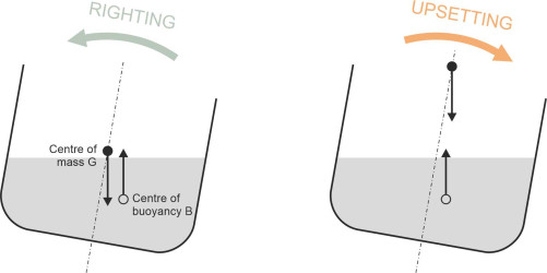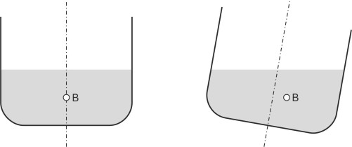 A ship’s hull presents a greater challenge, because (a) the geometry at the stem and stern is more complicated than that of a rectangular block, and (b) its centre of gravity G can in principle lie anywhere within the volume enclosed by the hull - the designer can move G around, for example by re-locating heavy items such as the engines low down, close to the keel. There is another factor to be taken into account, because when a ship heels to one side, the buoyancy force moves as well. Its position is tied to the body of the water that the hull displaces, which changes shape whenever the hull rotates away from its normal alignment. Hence the ship’s ability to resist a capsize depends not only on the weight distribution but also on geometry of the hull cross-section.