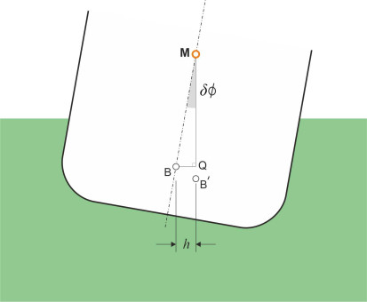 \[\begin{equation} h \quad = \quad \frac{\text{Wedge restoring couple}}{\text{Buoyancy force}}\quad = \quad \frac{ \rho g I_{\text{area}} \delta \phi }{ \rho g \nabla }\quad = \quad \frac{I_{\text{area}}}{\nabla }\delta \phi \end{equation}\]and since in the triangle MBQ the base \(h\) is asymptotically equal to \(\overline{\text{MB}} \times \delta \phi\), there follows a simple and elegant result: