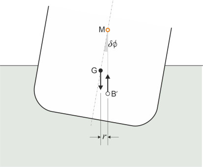 \[\begin{equation} r \quad = \quad \overline{\text{MG}}\ \times \ \delta \phi \end{equation}\]so the higher the metacentre above G, the more powerful the righting action. On the other hand if M lies below G, the distance \(\overline{\text{MG}}\) becomes negative, the righting couple becomes an upsetting (clockwise) couple, and any disturbance will cause the angle of heel to increase.