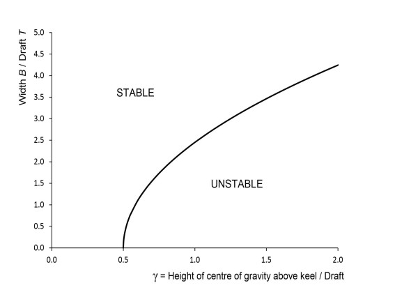 \[\begin{equation} \left( \frac{B}{T} \right)^{2} \quad = \quad 6 \left( 2 \gamma - 1 \right) \end{equation}\]This equation is plotted in figure 13. It represents the minimum requirement for a stable vessel, and you can think of the area around the curve as a map. Each point on the map signifies a hull of specific proportions (expressed in terms of the ratio \(B/T\)) whose centre of gravity is located in a specific position. Ships that correspond to points above the curve are hydrostatically stable, and the further the point lies above the curve, the greater the margin of stability. Note that for most large ships, the centre of gravity is located at or above the waterline, so that \(\gamma\) is greater than one. If for the sake of argument we put \(\gamma = 1\) in equation 14, we see that for a rectangular hull of this description to be stable, \(B/T\) must be appreciably greater than \(\sqrt{6}\), so that the beam is greater than about 2.5 times the draft.