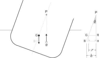 \[\begin{eqnarray} h \quad & = & \quad \frac{\text{Wedge righting couple}}{\text{Buoyancy force}} \quad \nonumber \\ & = & \quad \frac{ \rho g I_{\text{area}} \sin \phi \left( 1 + \frac{1}{2}\tan^{2} \phi \right)}{\rho g \nabla } \nonumber \\ & = & \quad \frac{I_{\text{area}}}{ \nabla } \sin \phi \left( 1 + \frac{1}{2} \tan^{2} \phi \right) \end{eqnarray}\]The buoyancy force now acts along the vertical line through B\('\), which intersects the centreline of the hull at P. Since in the triangle PBH, the base \(h\) is equal to \(\overline{\text{PB}} \times \sin \phi\), it follows that