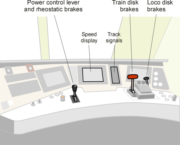 The first braking mode relies on the intrinsic resistance to motion of the train to produce a gradual deceleration without any brakes applied at all. The second relies on rheostatic brakes, which are confined to the power bogies. Rheostatic brakes yield a smooth retarding force whose effect is most pronounced when moving at speed: it falls away to zero as the train approaches a standstill. It’s the third mode, mechanical braking, that brings the train to a halt, and operators distinguish between three different levels of intensity: light braking, full service braking and emergency braking. The mechanical brakes are either disk brakes or shoe brakes, triggered by an air pipe that links all the vehicles in the train. On some high-speed trains, the driver can apply both rheostatic brakes and mechanical brakes through a single lever that invokes an appropriately phased sequence under microprocessor control [10]. On older trains, the two types have separate control handles, and the driver can apply them independently. The ability to brake the loco on its own is important for freight trains, which are tricky to manage, and drivers learn various techniques for avoiding longitudinal impacts among the wagons that can damage couplings or bounce a wheelset off the rails. For example, when it becomes necessary to brake the train after moving along at a steady speed, it’s useful to bunch the wagons together well in advance, by applying minimal air braking about 20 s before the service operation [6].