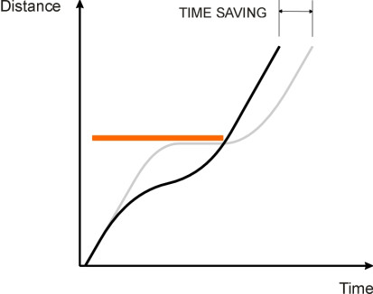 Paradoxically, a train can be delayed by travelling too fast at the wrong moment as shown in figure 10. This often happens on the approach to a red signal. If it were possible to predict the future the driver would brake earlier rather than later so that the train arrives at the signal and is still moving as it clears to green. More generally, a driver tries to anticipate speed limits, which in the UK are shown on circular disks beside the track, and where possible to allow the natural resistance of the train to slow it down in advance so that less braking effort is required.