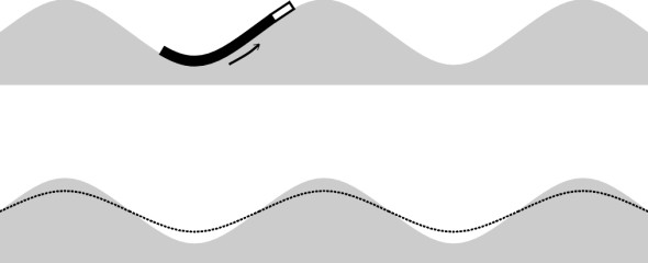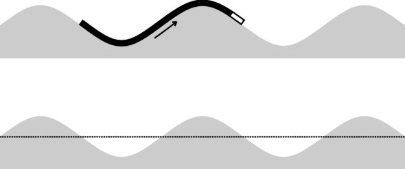 Incidentally, in undulating territory a long train needs less power per wagon than a shorter one. In figure 11, a locomotive highlighted in white is shown hauling a formation over a series of peaks and troughs. On an uphill grade, the loco must provide extra traction to overcome the gravitational pull on the wagons. But once the loco reaches the peak and begins to descend, this is partly counterbalanced by the gravitational component of the leading vehicles on the downhill side acting in the forward direction. To put it another way, the path traced out by the centre of mass of the train, as shown by the dotted line in the drawing, does not have to rise and fall to the same extent as would the path of a single wagon on its own. In the extreme case shown in figure 12, the length of the train equals the wavelength of the undulations. Hence the centre of mass follows a level path, and the energy needed to overcome gravitational resistance is zero: the train might just as well be travelling on level ground. In theory, there are circumstances in which the journey time can be shortened by adding more wagons to the train.